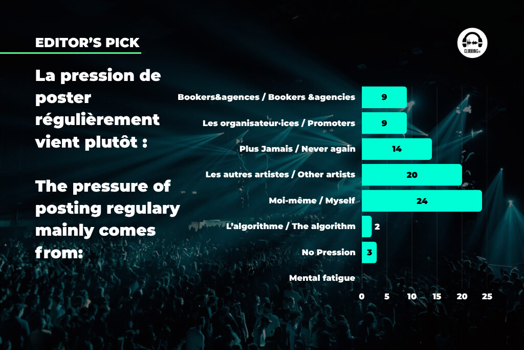 83.87% of the DJs surveyed say they have already felt pressure to post regularly. And when asked where that pressure comes from, the algorithm is named first (77.42%), followed by themselves (64.52%), other artists (45.16%), then bookers or agencies and event organizers (both at 29.03%). Only 6.45% say they feel no particular pressure.