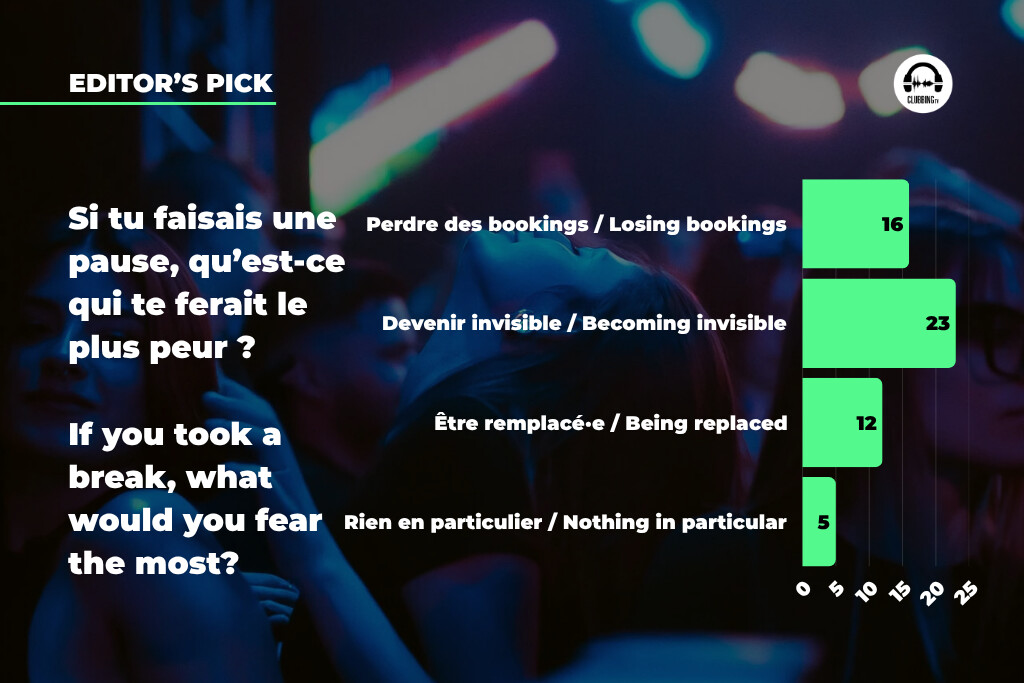 If many DJs think about taking a break, it is not out of simple digital weariness. Among those who have already considered it, 66.67% mention mental fatigue, 61.90% a loss of meaning, 57.14% the need to refocus on music, and 52.38% performance pressure. Rejection of algorithm-driven logic is mentioned by 42.86%, while 28.57% refer to harassment or constant comparison.
