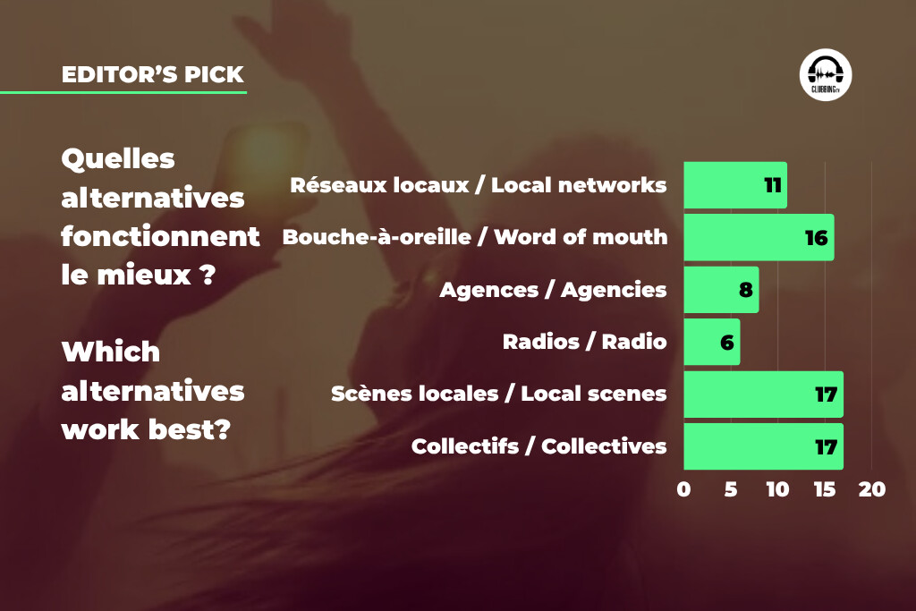And yet the survey does not completely close the horizon. When asked which alternatives work best, the responses focus on more embodied forms of circulation: local scenes and collectives are each cited by 70.83% of respondents, word of mouth by 66.67%, local networks by 45.83%, agencies by 33.33%, and radio by 25%.